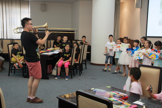819下午,在色彩与旋律的互动体验活动中特别邀请了中央音乐学院的专业长号演奏员赵伟伟叔叔来到现场与小营员们互动。当音乐响起,每个人都凝神屏息,小营员们似乎被带到了另一个世界。随着赵伟伟叔叔的现场演奏,指导老师带领小营员们用肢体体会音乐节奏,感知点、线、面等绘画语言,激发孩子们音乐与美术的通感。之后,赵伟伟叔叔现场演奏了不同风格的音乐,小营员们将自己对音乐的感受和理解用绘画形式呈现出来。小营员们表示这是一次难忘的绘画创作体验。