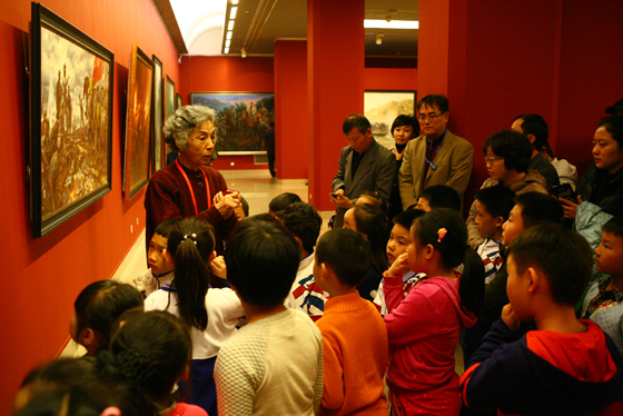 上午,史家小学的同学和家长在中国美术馆优秀志愿者庄则平奶奶的带领下参观学习了“纪念中国工农红军长征胜利80周年美术作品展”。孩子与家长被革命先烈的英雄壮举深深地感染了,在《湘江湘江》画作前,他们被那壮烈的战争景象震撼了;在遵义会议的长卷前,他们了解了这一影响中国革命的关键转折点事件;在四渡赤水作品前,他们感慨毛主席用兵的艺术……
