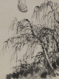 1928年所作的《柳岸帆影》是陈半丁早年参照清初石涛画风所作的山水作品。陈半丁作山水,广师博览,尤以石涛山水画风为最爱。他早年连续两番临摹石涛册页,在笔墨点划间逐步习得石涛山水的皴擦点染之法。之后数年,陈半丁但凡见到石涛作品,均要仔细研习。据启功先生回忆,陈半丁讲临摹时曾说,“对临名画,往往只得其外形,而不知其所以然。对临名画,须用‘意临’”。陈半丁临笔不仅在学石涛绘画之“法”,更在体悟石涛山水之“境”、继承着他的画学之“思”,由此生发出属于自己的山水笔墨语言。这一点在《柳岸帆影》一作已初见端倪。作品构图简洁,透过近景坡岸柳林可见一小帆遥遥驶来,用笔繁简得宜、疏密有致,通篇墨气淋漓。仔细观之,可见其柳丝与苔点的排布中略少一些石涛的洒脱肆意,而多了来自传统书写的排布,从而使整幅作品于动态中更带有几分宁静和文人气,这便是陈半丁的艺术笔法。“宇内虽广,此道无人,皆归形似,何有临摹墨哉”,这段题写于画幅上方的文字写明了陈半丁的山水临习心得。陈半丁以石涛之法作山水,师其画境而不为其形所束缚,晚年作品更在技法之外追求画面意境的空灵与悠远,所描画的不仅是一山一水,更是他内心的桃花源地。
