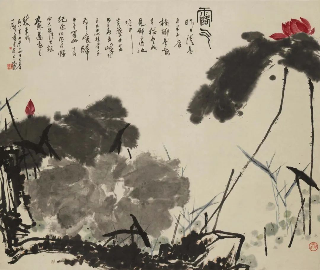 潘天寿(1897-1971) 原名天授,字大颐,号寿者。浙江宁海人。现代画家、教育家。他的画风气势磅礴,奇崛高古,“一味霸悍”之气撼人心弦。其用笔古拙劲健,常以书入画,多以隶书、魏碑方折觚线勾勒造形,如“屋漏痕”、“折钗股”,大起大落,收放自如。作于1958年的《露气》,是潘天寿与浙江美院师生下乡、参观早稻丰收后所创作。此画继承了吴昌硕写意花鸟画大气磅礴的风格,落墨凝练泼辣,并集众家之长,将中国画中点、线、面的表现形式发挥到极致。此画“从高处、远处、大处和最新奇处立意”,几片水墨淋漓的荷叶,恣意放纵,浓淡有致。莲茎用笔老辣遒劲,错落有致,穿插于荷叶间。半掩于荷叶之后的莲花,一收一放,着色古艳清雅。底边以浓重线条所绘的岩石,沉着痛快,将整个画面收住。虽未直接渲染露气,但以酣畅笔墨点出了露气弥漫的氛围,给人以慑人的张力和极简的结构美,同时洋溢着勃勃生机。此画“意写而工巧”,经得起深入推敲,真正做到“致广大,尽精微”。 潘天寿不仅在艺术创作上有突出成就,而且在美术教育方面也有着巨大的贡献,其将人生中的半个世纪都付诸于教学生涯与创作实践,他曾说过,“我这一辈子是个教书匠,画画只是副业”,可见其对自身定位以及对美术教育的重视。