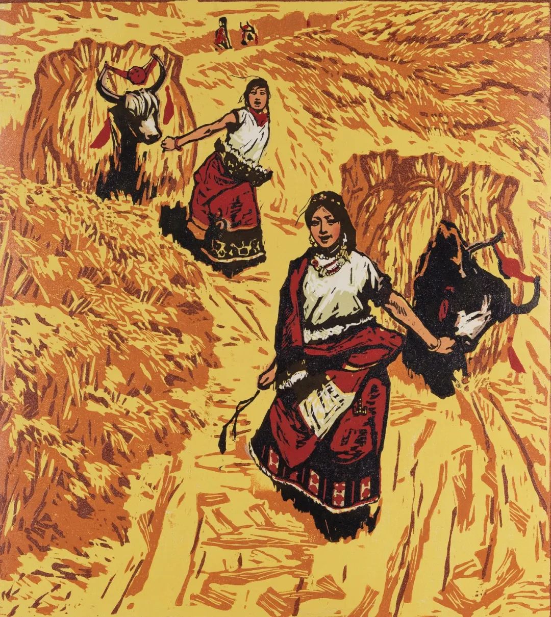 套色木刻是将画面里不同色块的内容分别雕刻在不同的木板上,分多次印制在画纸上,利用色彩间的相互叠加,互相配合、补充、衬托,构成形色具备的画面。在这件作品中,艺术家将鲜亮明快的黄色做为主色,赭石为辅,表现出一望无际的麦浪。画面由近及远层层展开,三位年轻的藏族少女阔步走来。她们身着白色上衣和枣红色藏袍,脖子上戴着藏族项链,充满了青春的朝气,身后牵着的牦牛头戴大红花,满载着大捆刚刚收割的青稞,激情昂扬的在金色田野里穿行。她们脸上绽放着灿烂的笑容,引吭高歌,洋溢着劳动丰收的喜悦,她们深情地望向家园,对幸福的新生活满怀憧憬。艺术家用绚烂的色彩,精炼的刀法,欢快的节奏,记录了藏区历史巨变的不朽诗史,《初踏黄金路》就是其中重要的作品之一。