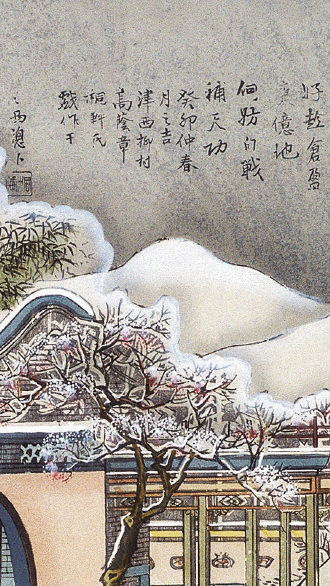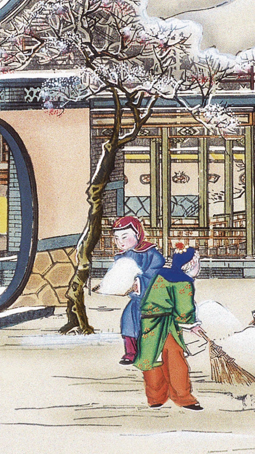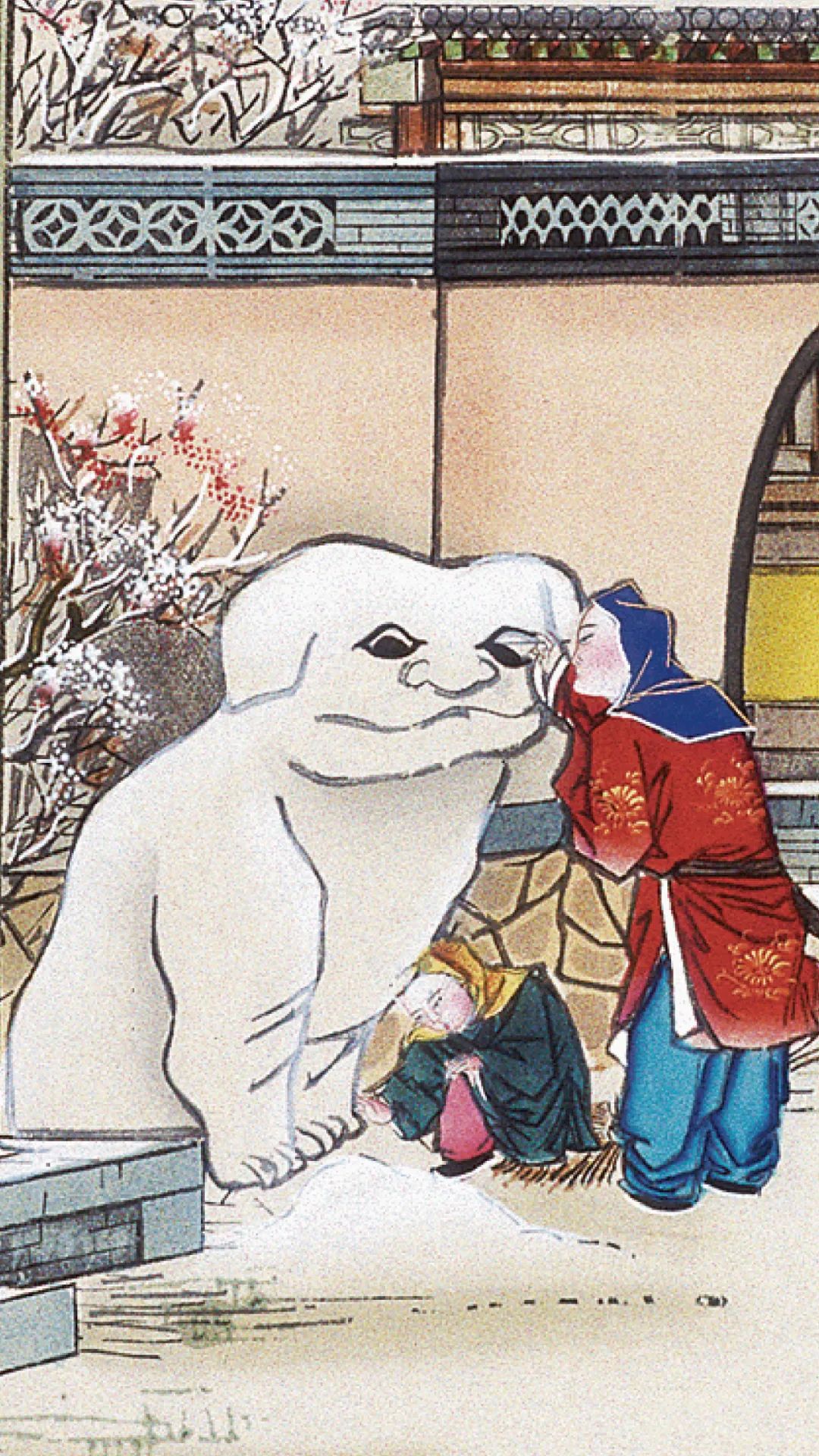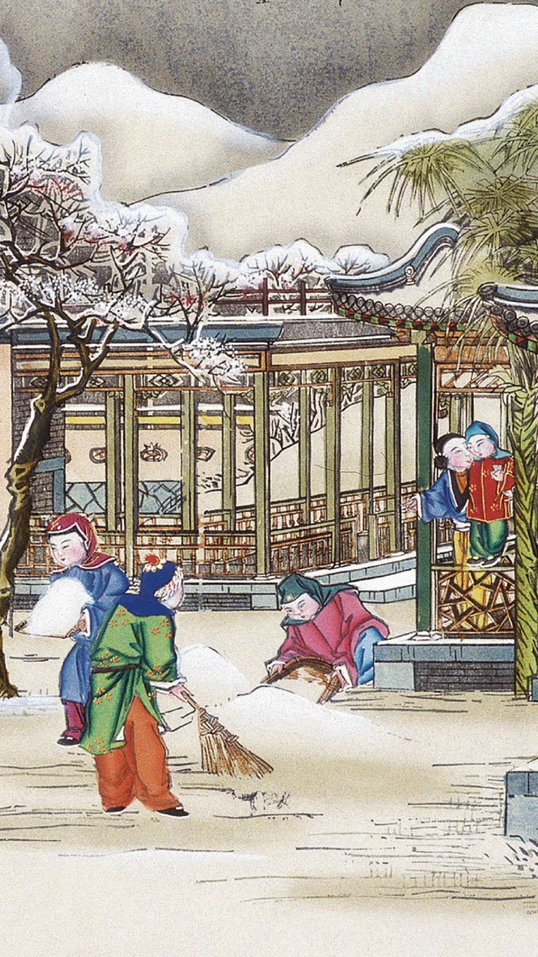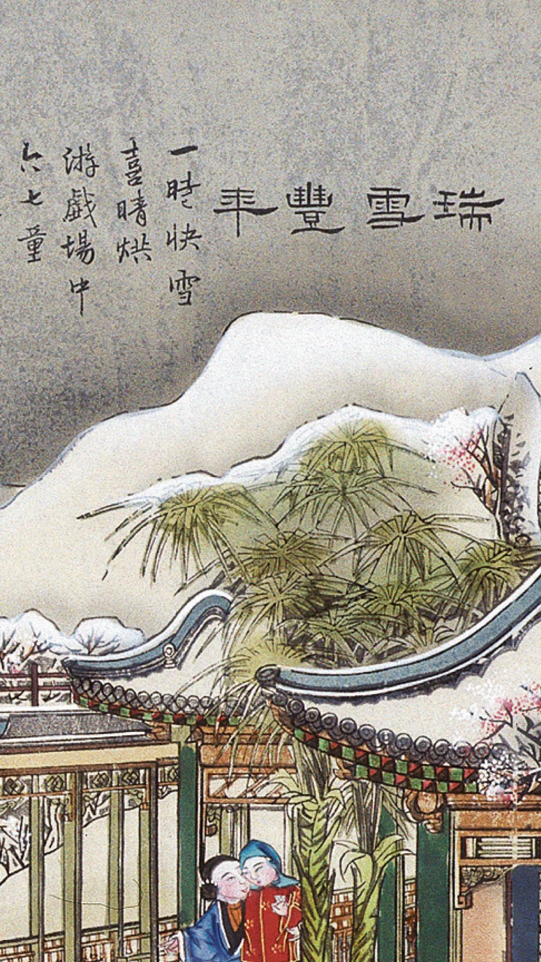 款识: 瑞雪丰年。一时快雪喜晴烘,游戏场中六七童。好趁仓盈庾亿地,何妨白战补天功。