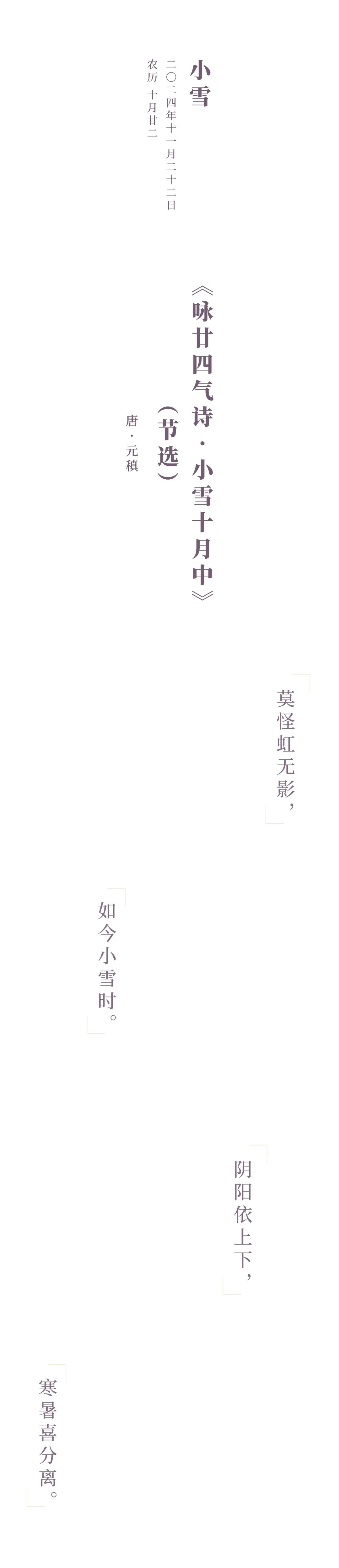 小雪,是二十四节气中的第20个节气,冬季第2个节气。此时,气温更低了,地面上的露珠变成了霜,天空中的雨变成了小雪花。