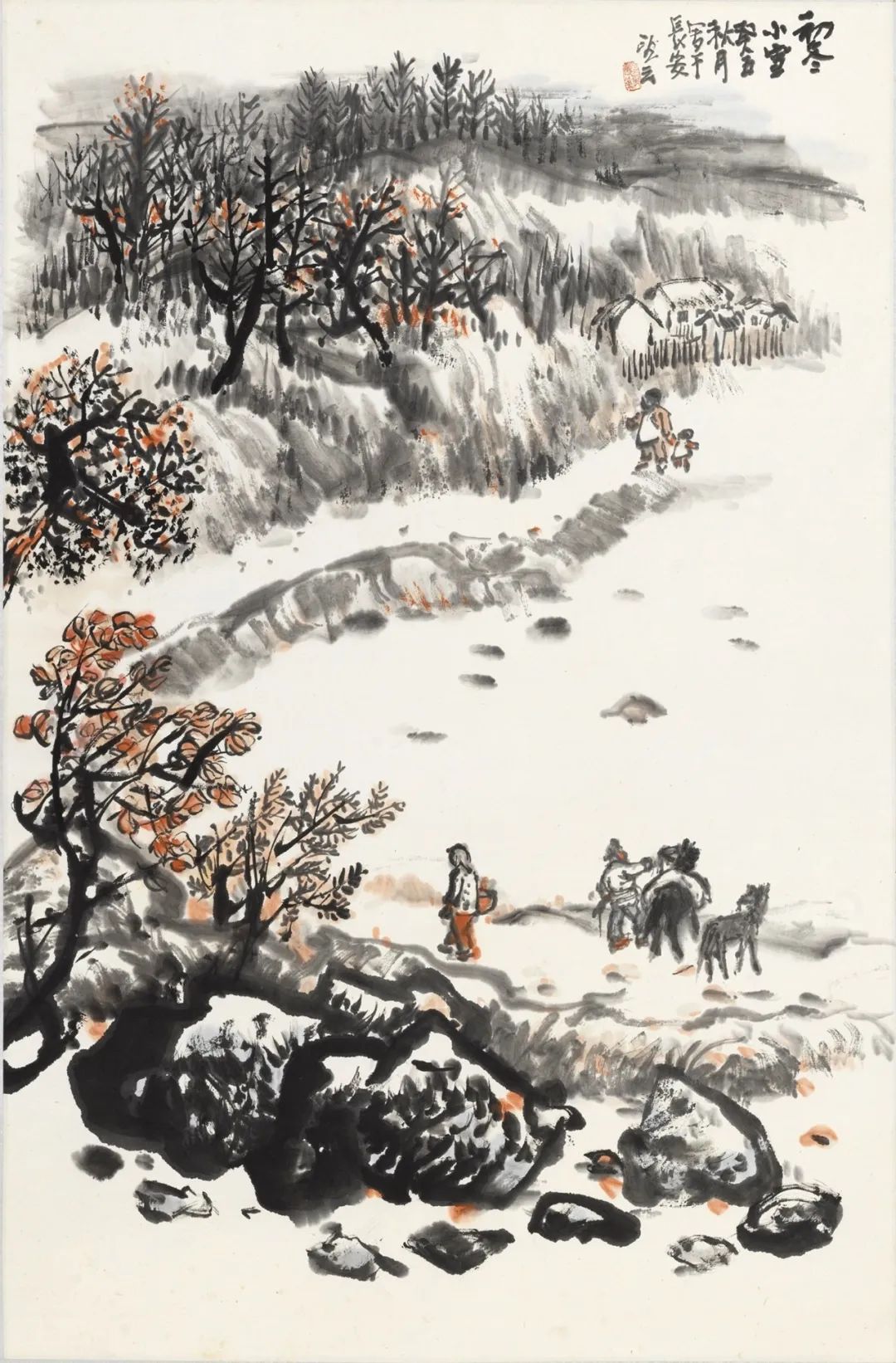 这幅中国美术馆收藏的《初冬小雪》,画家赵望云巧妙捕捉到了初雪覆盖下乡村的宁静与和谐之美。画面呈“C”字形构图,远处起伏的山峦上树木林立,浓墨勾勒树枝,少许赭红点染黄叶,渲染出初冬时节尚存的温暖绚烂。地面上薄雪轻覆,透露出一股清新而寒凉的气息。画面中间水塘边一条蜿蜒的小路通向不远处的房舍,小路上大人手牵孩童,温馨行进。画面下方,红脸汉子正拉拽满载货物的毛驴,旁边女子挎着篮子走在道旁。整幅画作用笔简练率真,没有繁复装饰,用最质朴的方式呈现日常生活场景,洋溢着浓浓的乡土气息,展现画家浑厚不失灵动的艺术风格。就像赵望云自述的:“我是乡间人,画自己身历其境的景物,在我感到是一种生活上的责任,此后我要以这种神圣的责任,做为终生生命之寄托。”