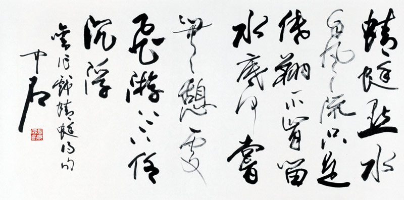 | 欧阳中石 69cm×137cm 2005年 释文:蜻蜓点水自风流,只是低翔不肯留。水底何尝无憩处,飞游上下任沉浮。 落款:旧作戏蜻蜓得句 中石 左下印:欧阳(白文) |