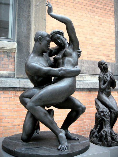 丹麦国家美术馆由新馆和老馆两部分组成,这几乎是世界众多国家美术博物馆的共同模式。随着藏品的不断增加和观众对美术馆的新要求,美术馆的空间要扩大,功能要完善。中国美术馆也在扩建新馆。丹麦国家美术馆的老馆正在维修,陈列的作品都集中到了新馆。新馆本来是以陈列现代作品为主,现在古典作品也过来了,就显得比较拥挤;而且新馆的设计比较适合现代美术作品,古典作品就差一些,视觉效果不太好。仰头看去,展示的作品密密麻麻一大片,像拍卖会的展示厅。当然,作品本身还是非常有价值的。