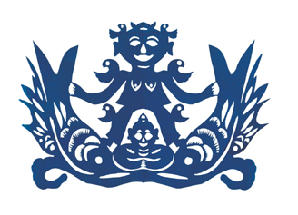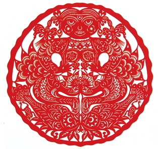 《抓髻娃娃》是黄土高原春节和婚俗合卺的团花喜花剪纸,团花是圜天旋转的宇宙,正中是象征保护神与繁衍之神“抓髻娃娃”,头梳双抓髻女性,下体剪刀向下意喻男阳,是阴阳两性天地合一的宇宙之神。它双臂抱繁衍人类万物,阴阳双鱼交尾相交,组成子孙万代繁衍不断的“万字不断头”符号。它的双乳与双鱼之间组成比喻子孙万代蝉联不断的神祇动物的蝉,左右为比喻生殖繁衍的笙和莲花符号,以及比喻子孙繁衍的双兔和双如意符号,组成可称为阴阳观与生生观合一的中国本原哲学符号交响组合的交响乐,它正是6000年前西安半坡仰韶文化彩陶盆“双鱼人面”的文化内涵与哲学符号延续。