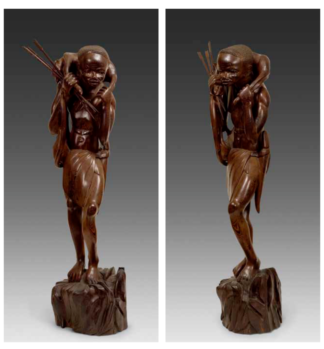 这件木雕作品出自刚果的雕塑家之手。作品塑造了一位打猎男性,具象化的造型处理与细节的丰满程度在非洲人像木雕中是比较突出的。人物脑门突出,几乎占据面部的一半,微微隆起且有清晰的抬头纹,这种夸张的表现在非洲木雕艺术中是智慧的象征;身材劲瘦,手臂和腹部有明显的、硬朗利落的肌肉线条,腹部轻微鼓起—这在非洲艺术传统中往往象征着生命的可持续性;在脚部的刻画上,作者强调了坚实的力量感,可以看到十趾分明的双脚与藤蔓般的雕塑基座相连。猎鹿男性赤裸着上半身,下半身穿着线条垂顺的草裙,腰间佩有箭囊。他的双手分别抓住猎物的前腿和后腿,将猎物绕过头顶背在双肩,猎物是一只幼鹿。被猎杀的小鹿身体绵软,失去生机,被打猎者牢牢掌控住,与之形成一种权力关系,也形成胜者与败者之间的张力。