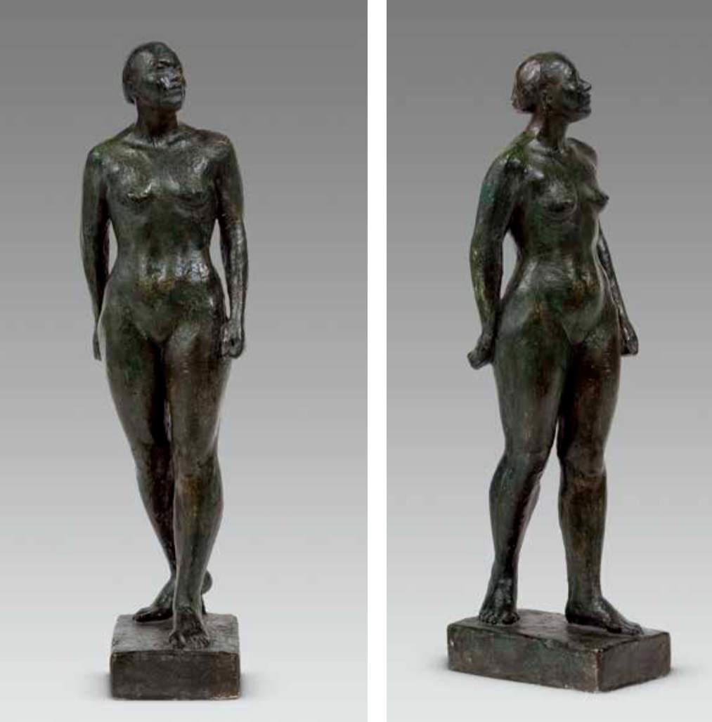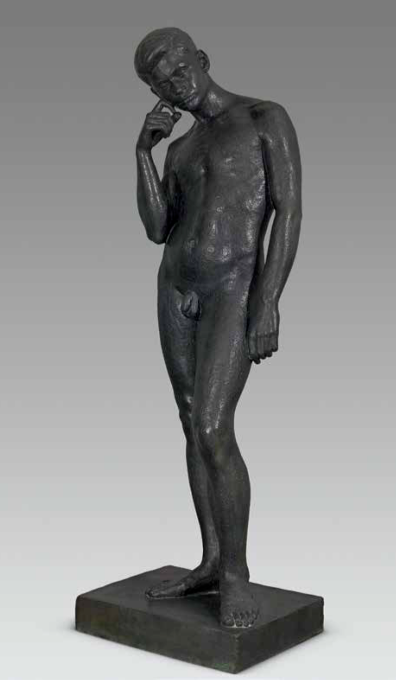 《沉思》是滑田友在法国时期创作的一件著名雕塑作品,深受法国学院派雕塑严谨作风的影响,1943年获巴黎春季艺术沙龙美展铜奖。作品刻画了一位正在思考的裸体少年,其形态生动,富有强烈的艺术感染力。少年左脚稍向前迈,呈稍息状,左手垂放于左腿之侧,右手抬起,以食指托腮。头部右倾,神情略显犹豫,仿佛在沉思中探寻某种真理或哲理。整个雕塑的线条流畅,结构准确,语言醇厚,形体浑然饱满,具有深沉的内在张力。此作源自雕塑家对模特的深入研究,通过对人体结构的精准把握和细致入微的刻画,展现了青少年健壮的肌肉和柔软的肌肤,将来自古希腊、古罗马艺术传统中的静穆与单纯,表现得淋漓尽致。