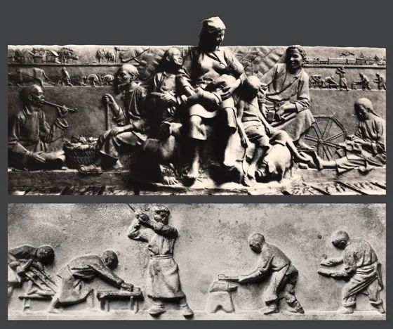 1945年,刘开渠创作了《农工之家》。这是刘开渠自主创作的大型作品,用雕塑形式反映现实生活、将工农形象作为创作题材,在中国雕塑史上是一个新的开端。这件作品的主要人物以作者自己和家人为原型,作品圆雕和高低浮雕并用,以一位乳子母亲的形象为中心,展开了一幅人民生活的立体画卷,整个画面形成一首朴素安定的田园交响曲,代表作者对田园生活的一种理想追求。