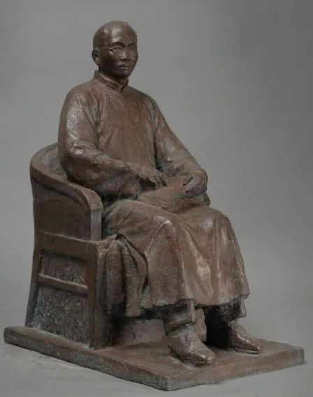 刘开渠曾多次为蔡元培塑像,包括1935年于杭州创作的蔡元培头像、1947年在上海创作的蔡元培胸像和1988年在上海静安公园落成的蔡元培纪念像。他一生多受蔡元培先生帮助,1928年,刘开渠在蔡元培的帮助下赴法留学,1933年,学成回国赴国立杭州艺术专科学校担任雕塑系教授。蔡元培先生是中国著名教育家、革命家和政治家,他采用“思想自由,兼容并包”的办学方针,开北大学术自由之风。他主张“以美育代宗教”,推动雕塑进入中国近代美术教育体系。坐像中的蔡元培先生正襟端坐,左手捧书卷一册,右手停留在卷本之上,似有所思索,头部上抬,嘴颌微抿显坚韧之貌,目眺远方似有所希冀。这种刻画不仅生动地展现了蔡元培先生的形象,也深刻地体现了其深厚的文化底蕴和坚定的文化自信。