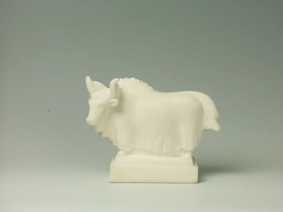 刘开渠通过对牦牛的深入观察和研究,将牦牛的形态和精神特质生动地表现出来。作品采用了大理石作为材质,通过精细的雕刻和打磨,使牦牛的形象栩栩如生,充满了生命力和力量感。在创作手法上,采用了类似于绘画中留白的抛光处理,对牛的鬃毛、尾巴及腿部的毛发以线描的形式进行勾勒,并通过石材的肌理表现出毛发的浓密感和真实感。这种处理方式不仅使作品更加生动自然,也展现了刘开渠深厚的艺术功底和精湛的技艺。